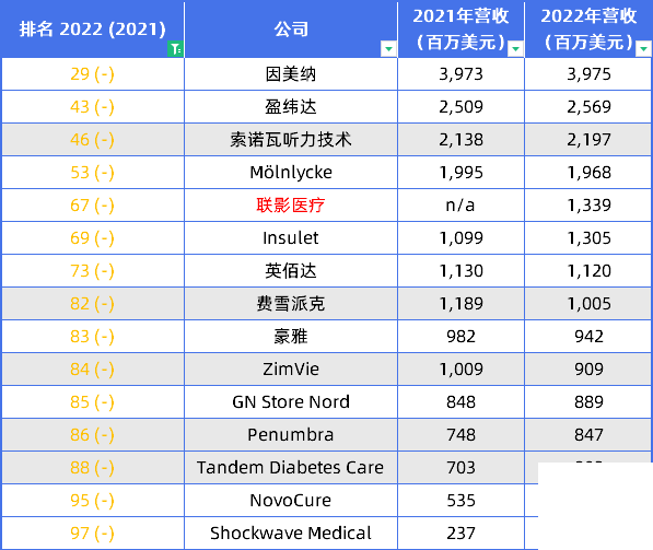 “Medtech insight第三方權威網(wǎng)站發(fā)布了全球醫(yī)療器械100強榜單。排名依據(jù)2022年醫(yī)療器械企業(yè)銷售額。據(jù)統(tǒng)計,本次入選百強的所有械企總年營收達到了4666.6億美元,總收入增長0.6%,這是繼新冠疫情第一年罕見下降后連續(xù)第二年增長。”