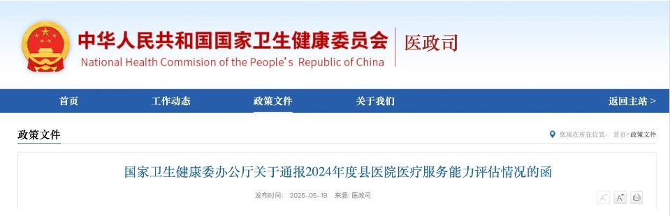 5月19日,國家衛健委發布《關于通報2024年度縣醫院醫療服務能力評估情況的函》(以下簡稱《函》)。
