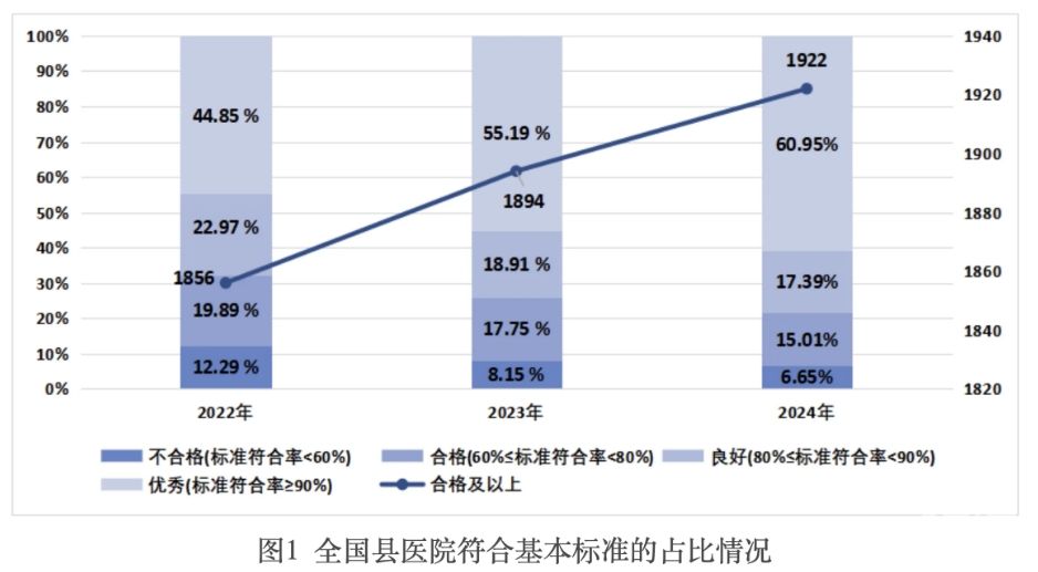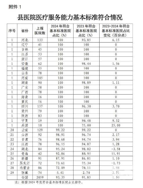 文件明確,2024年度參評醫院2059家,縣域覆蓋率98.93%。根據國家衛健委2016年印發的縣醫院醫療服務能力基本標準和推薦標準(其中,基本標準相當于二級醫院能力,推薦標準相當于三級醫院能力),有1922家(占比93.35%,提高1.50個百分點)符合基本標準,1309家(占比63.57%,提高7.17個百分點)符合推薦標準,較2023年度分別增加28家、146家。
