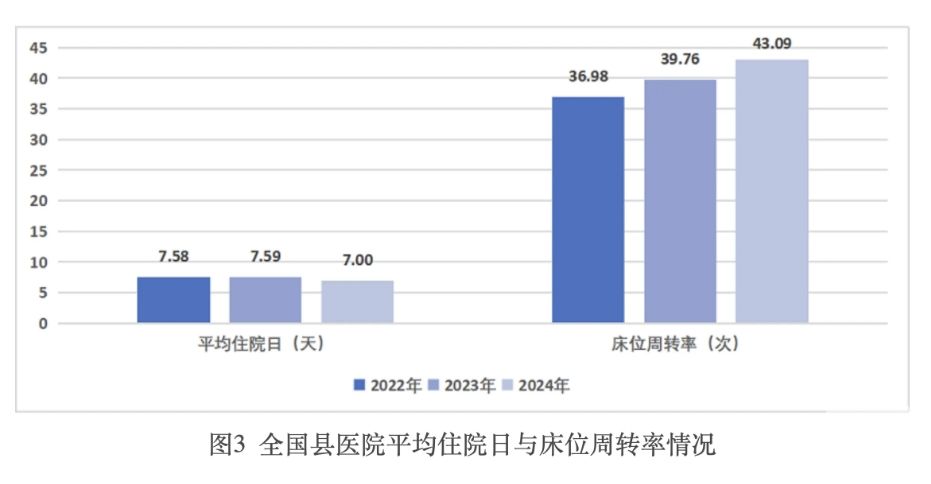 全國平均每家縣醫院編制床位和開放床位分別為548張和600張;平均住院日7.00天,較2023年降低0.59天;床位周轉率43.09次,較2023年增長3.33次。