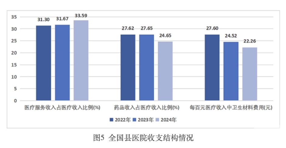 2024年度平均每家縣醫院年收入約為3.54億元,較2023年度增長1.13%。平均每家縣醫院醫療收入為2.99億元,其中,醫療服務收入占醫療收入比例為33.59%,較2023年提高了1.92個百分點。