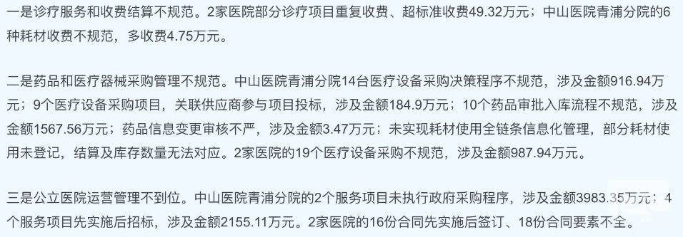 例如:中山醫院青浦分院14臺醫療設備采購決策程序不規范,涉及金額916.94萬元;9個醫療設備采購項目,關聯供應商參與項目投標,涉及金額184.9萬元;2家醫院的19個醫療設備采購不規范,涉及金額987.94萬元等。完整調查結果如下: