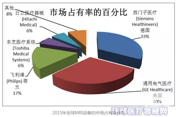 從全球范圍來講,MRI的市場長期被西門子、GE和飛利浦這三大巨頭壟斷,2015年全球MRI市場規模為36.5億美元,這三家公司的市場占有率的總和就達到了80%。